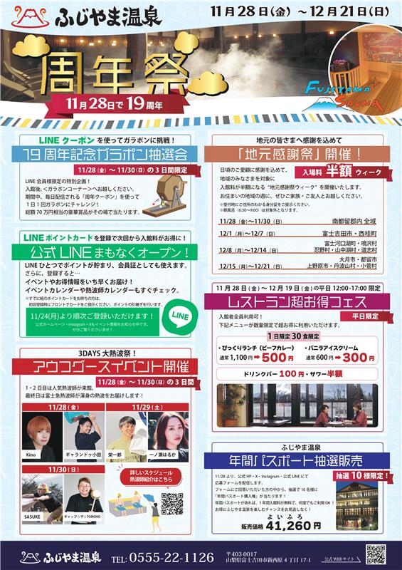 ふじやま温泉は11月28日(金)に19周年を迎えます。